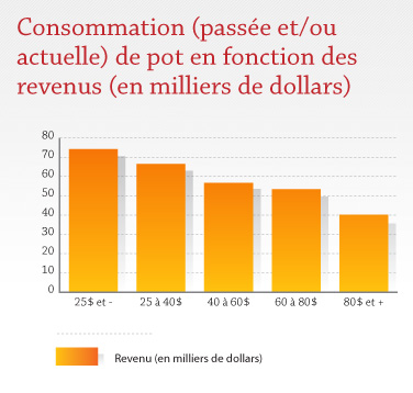 Cette consommation passée ou présente de marijuana passe du simple au double entre les personnes plus âgées (35% chez les 55-64 ans) et celles plus jeunes (70% chez les 18-24 ans). Le même phénomène s'observe en ce qui à trait aux revenus, les répondants avec des revenus de 80 000$ et plus sont presque 2 fois moins nombreux à avoir déjà consommé du pot (40% vs 74%) que ceux qui affichent les revenus les plus faibles.